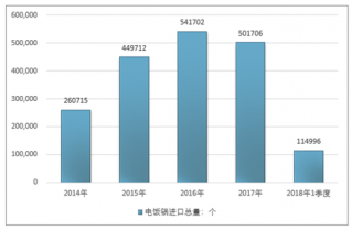 2016年我國電飯鍋進口總量541702個,2017年進口總量501706個;2018年1季度進口總量114996個。