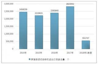 2016年我國蒸餾滲濾式咖啡機(jī)進(jìn)出口貿(mào)易總量2393640個(gè),2017年進(jìn)出口貿(mào)易總量2823052個(gè);2018年1季度進(jìn)出口貿(mào)易總量551737個(gè)。