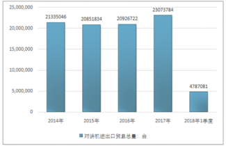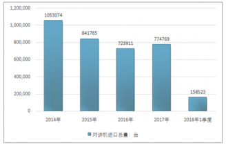 2016年我國(guó)對(duì)講機(jī)進(jìn)口總額87665511美元,2017年進(jìn)口總額87159827美元;2018年1季度進(jìn)口總額27739833美元。