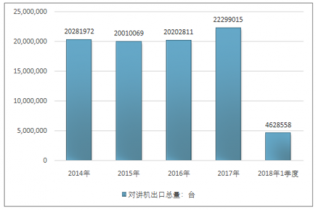 2016年我國(guó)對(duì)講機(jī)出口總額465088034美元,2017年出口總額524800832美元;2018年1季度出口總額138426078美元。
