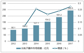 由于互聯(lián)網(wǎng)業(yè)務(wù)的迅速發(fā)展和音頻、視頻、數(shù)據(jù)、多媒體應(yīng)用的快速增長(zhǎng),國(guó)內(nèi)外用戶(hù)對(duì)大容量光纖網(wǎng)絡(luò)和傳輸系統(tǒng)有了更為迫切的需求,光電子器件作為光纖通信中的核心部件,近年來(lái)市場(chǎng)需求保持旺盛。國(guó)家“十三五”規(guī)劃和2020年長(zhǎng)期規(guī)劃均提出了對(duì)光纖通信中最核心的光電子器件的發(fā)展進(jìn)行鼓勵(lì)和扶持,近年來(lái)全球光電子器件制造業(yè)加速向國(guó)內(nèi)進(jìn)行產(chǎn)業(yè)轉(zhuǎn)移,我國(guó)光電子器件市場(chǎng)規(guī)模持續(xù)擴(kuò)大,制造水平持續(xù)提高。根據(jù)數(shù)據(jù)顯示,2017年我國(guó)光電子器件市場(chǎng)規(guī)模為243.5億元,較2016年的191.2億元增長(zhǎng)27.35%。