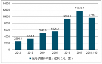 光電子器件應(yīng)用范圍十分廣闊,如家用攝像機(jī)、手機(jī)相機(jī)、夜視眼鏡、微光攝像機(jī)、光電瞄具、紅外探測(cè)、紅外制導(dǎo)、紅外遙感、指紋探測(cè)、導(dǎo)彈探測(cè)、醫(yī)學(xué)檢測(cè)和透視等等,從產(chǎn)品擴(kuò)展到民用產(chǎn)品,其使用范圍難以勝數(shù),是一個(gè)巨大的產(chǎn)業(yè)。隨著我國(guó)經(jīng)濟(jì)的發(fā)展,光通訊的不斷進(jìn)步,光電子器件生產(chǎn)需求不斷擴(kuò)大,在需求不斷擴(kuò)大的刺激下,我國(guó)光電子器件產(chǎn)品產(chǎn)量有所突破。根據(jù)數(shù)據(jù)顯示,2017年中國(guó)光電子器件產(chǎn)量為11770.7億只(片、套),2018年1-10月我國(guó)光電子器件產(chǎn)量為9716.0億只(片、套),產(chǎn)量較2017年同期增長(zhǎng)0.7%。