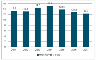 2017年中國鐵礦石原礦累計產(chǎn)量為12.3億噸,同比下滑3.9%;預(yù)計2019年中國鐵礦石原礦累計產(chǎn)量將達(dá)12.5億噸。