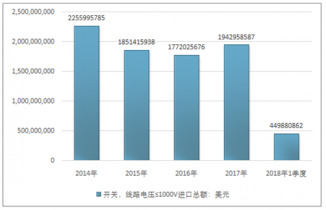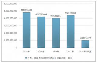 2016年我國(guó)開關(guān),線路電壓≤1000V進(jìn)出口貿(mào)易總額4021322177美元,2017年進(jìn)出口貿(mào)易總額4421408001美元;2018年1季度進(jìn)出口貿(mào)易總額1018042379美元。