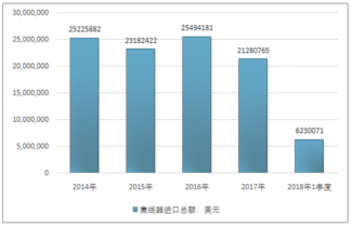 2016年我國集線器進口總額25494181美元,2017年進口總額21280765美元;2018年1季度進口總額6230071美元。