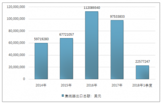 2016年我國集線器出口總額112089340美元,2017年出口總額97533833美元;2018年1季度出口總額22577247美元。