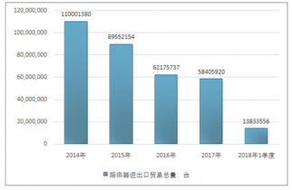 2014-2018年1季度路由器進出口貿(mào)易總量走勢圖(單位:臺)