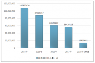 2016年我國路由器出口總量60628177臺,2017年出口總量56426116臺;2018年1季度出口總量13410681臺。