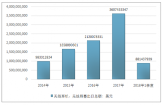2016年我國無線耳機(jī)、無線耳塞出口總額2120078331美元,2017年出口總額3607433347美元;2018年1季度出口總額881437939美元。
