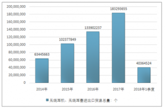 2016年我國無線耳機(jī)、無線耳塞進(jìn)出口貿(mào)易總量133902237個(gè),2017年進(jìn)出口貿(mào)易總量183293655個(gè);2018年1季度進(jìn)出口貿(mào)易總量40364524個(gè)。