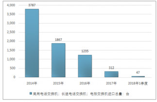 2016年我國局用電話交換機(jī);長途電話交換機(jī);電報交換機(jī)進(jìn)口總量1235臺,2017年進(jìn)口總量312臺;2018年1季度進(jìn)口總量47臺。