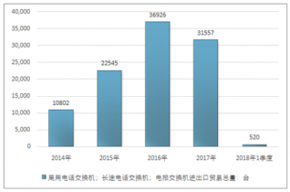 2016年我國局用電話交換機(jī);長途電話交換機(jī);電報交換機(jī)進(jìn)出口貿(mào)易總量36926臺,2017年進(jìn)出口貿(mào)易總量31557臺;2018年1季度進(jìn)出口貿(mào)易總量520臺。
