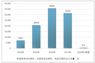 2016年我國局用電話交換機(jī);長途電話交換機(jī);電報交換機(jī)出口總量35691臺,2017年出口總量31245臺;2018年1季度出口總量473臺。