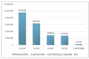 2016年我國局用電話交換機;長途電話交換機;電報交換機進出口貿(mào)易總額2838444美元,2017年進出口貿(mào)易總額2673351美元;2018年1季度進出口貿(mào)易總額173759美元。
