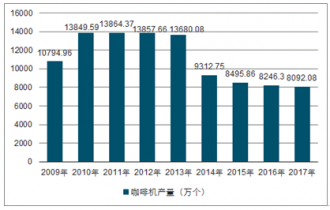 近幾年我國咖啡機產量整體呈現(xiàn)下降態(tài)勢,主要是出口市場需求下降。但是由國內市場的需求增加,我國開咖啡機產量下降速度相對較慢。2009年我國咖啡機行業(yè)產量10794.96萬個到2017年國內咖啡機行業(yè)產量8092.08萬個。
