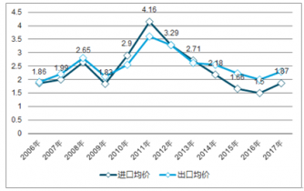2006-2017年我國(guó)橡膠進(jìn)出口均價(jià)