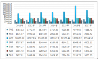 2011-2017年我國健康體檢人群分地區(qū)統(tǒng)計