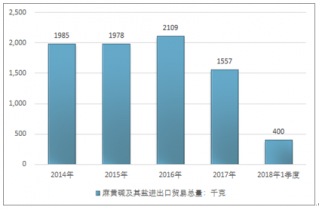 2016年我國(guó)麻黃堿及其鹽進(jìn)出口貿(mào)易總量2109千克,2017年進(jìn)出口貿(mào)易總量1557千克;2018年1季度進(jìn)出口貿(mào)易總量400千克。