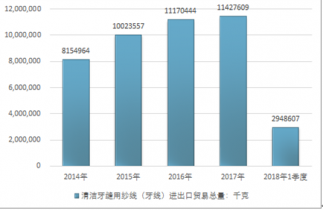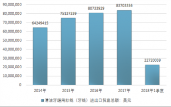 2016年我國清潔牙縫用紗線(牙線)進(jìn)出口貿(mào)易總額80733929美元,2017年進(jìn)出口貿(mào)易總額83703356美元;2018年1季度進(jìn)出口貿(mào)易總額22720039美元。