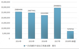 2016年我國(guó)一次成像軟片進(jìn)出口貿(mào)易總額22424584美元,2017年進(jìn)出口貿(mào)易總額29486831美元;2018年1季度進(jìn)出口貿(mào)易總額7270744美元。