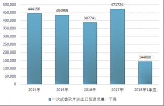 2016年我國(guó)一次成像軟片進(jìn)出口貿(mào)易總量387741千克,2017年進(jìn)出口貿(mào)易總量471724千克;2018年1季度進(jìn)出口貿(mào)易總量144000千克。