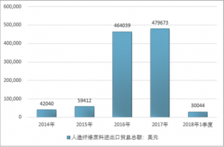 2016年我國人造纖維廢料進(jìn)出口貿(mào)易總額464039美元,2017年進(jìn)出口貿(mào)易總額479673美元;2018年1季度進(jìn)出口貿(mào)易總額30044美元。
