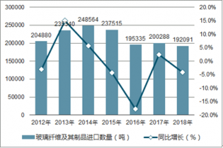 2018年1-12月中國玻璃纖維及其制品進口數(shù)量為192091噸,同比下降4.1%;2018年1-12月中國玻璃纖維及其制品進口金額為934536千美元,同比增長0.3%。