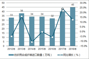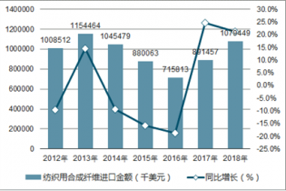 2018年1-12月中國紡織用合成纖維進口數(shù)量為45萬噸,同比增長12.5%;2018年1-12月中國紡織用合成纖維進口金額為1079449千美元,同比增長21.1%。