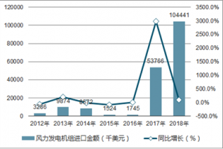 2018年1-12月中國風(fēng)力發(fā)電機(jī)組進(jìn)口數(shù)量為293臺,同比增長388.3%;2018年1-12月中國風(fēng)力發(fā)電機(jī)組進(jìn)口金額為104441千美元,同比增長94.3%。