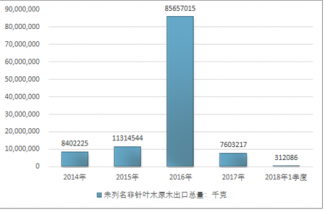 2016年我國(guó)未列名非針葉木原木進(jìn)出口貿(mào)易總量7318829374千克,2017年進(jìn)出口貿(mào)易總量2486835649千克;2018年1季度進(jìn)出口貿(mào)易總量679729334千克。