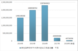 2016年我國其他溫帶非針葉木原木進出口貿(mào)易總量2297843815千克,2017年進出口貿(mào)易總量200009485千克;2018年1季度進出口貿(mào)易總量40726356千克。