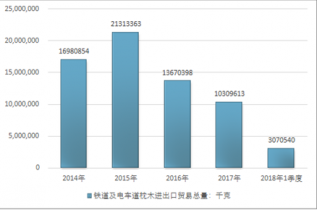 2016年我國(guó)鐵道及電車道枕木進(jìn)出口貿(mào)易總量13670398千克,2017年進(jìn)出口貿(mào)易總量10309613千克;2018年1季度進(jìn)出口貿(mào)易總量3070540千克。