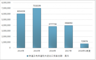 2016年我國(guó)鐵道及電車道枕木進(jìn)出口貿(mào)易總額3777738美元,2017年進(jìn)出口貿(mào)易總額3968092美元;2018年1季度進(jìn)出口貿(mào)易總額729076美元。