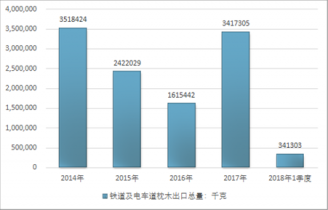 2016年我國(guó)鐵道及電車道枕木出口總量1615442千克,2017年出口總量3417305千克;2018年1季度出口總量341303千克。