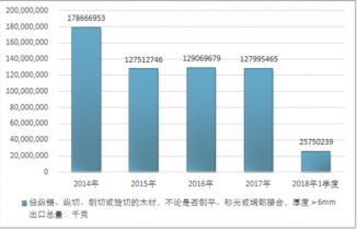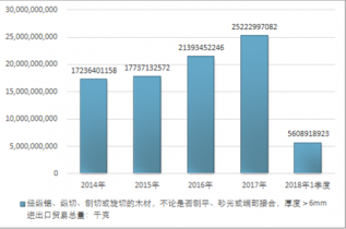 2016年我國經(jīng)縱鋸、縱切、刨切或旋切的木材,不論是否刨平、砂光或端部接合,厚度>6mm>6mm進(jìn)出口貿(mào)易總量21393452246千克,2017年進(jìn)出口貿(mào)易總量25222997082千克;2018年1季度進(jìn)出口貿(mào)易總量5608918923千克。