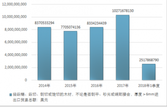 2016年我國經(jīng)縱鋸、縱切、刨切或旋切的木材,不論是否刨平、砂光或端部接合,厚度>6mm>6mm進(jìn)出口貿(mào)易總額8334234439美元,2017年進(jìn)出口貿(mào)易總額10271678130美元;2018年1季度進(jìn)出口貿(mào)易總額2517868790美元。