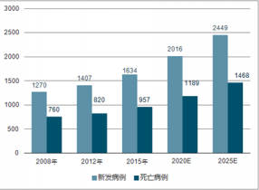 全球有近 1/6 的死亡是由癌癥造成的。《2015 全球癌癥統(tǒng)計》數(shù)據(jù)顯示, 2012 年全球新增約 1410 萬例癌癥病例,癌癥死亡人數(shù)達(dá) 820 萬。預(yù)計到 2025 年,全球每年新增癌癥病例數(shù)將高達(dá) 2449 萬例。
