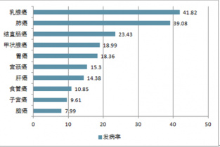 我國癌癥發(fā)病率TOP10(發(fā)病人數(shù)/10萬)