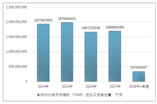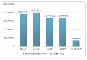 2016年我國(guó)技術(shù)分類天然橡膠(TSNR)進(jìn)出口貿(mào)易總量1667235558千克,2017年進(jìn)出口貿(mào)易總量1689892060千克;2018年1季度進(jìn)出口貿(mào)易總量337629207千克。