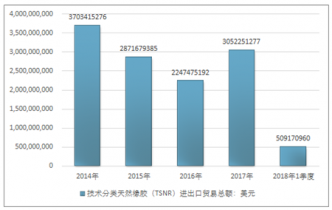 2016年我國(guó)技術(shù)分類天然橡膠(TSNR)進(jìn)出口貿(mào)易總額2247475192美元,2017年進(jìn)出口貿(mào)易總額3052251277美元;2018年1季度進(jìn)出口貿(mào)易總額509170960美元。