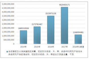 2016年我國合成橡膠及從油類提取的油膏,初級形狀或板、片、帶;品目4001所列產品與本品目所列產品的混合物,初級形狀或板、片、帶進出口貿易總量3523973139千克,2017年進出口貿易總量4625403171千克;2018年1季度進出口貿易總量1166004481千克。