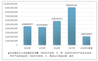 2016年我國合成橡膠及從油類提取的油膏,初級形狀或板、片、帶;品目4001所列產品與本品目所列產品的混合物,初級形狀或板、片、帶進出口貿易總額5792783271美元,2017年進出口貿易總額9082253162美元;2018年1季度進出口貿易總額2090106915美元。