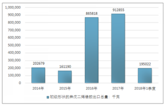 2016年我國初級形狀的異戊二烯橡膠出口總量865818千克,2017年出口總量912855千克;2018年1季度出口總量195022千克。