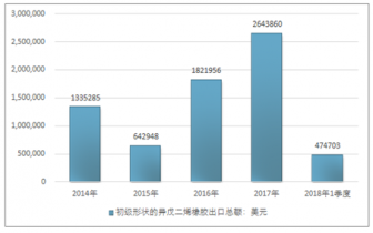 2016年我國初級形狀的異戊二烯橡膠出口總額1821956美元,2017年出口總額2643860美元;2018年1季度出口總額474703美元。