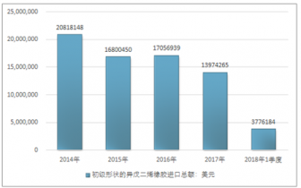 2016年我國初級形狀的異戊二烯橡膠進(jìn)口總額17056939美元,2017年進(jìn)口總額13974265美元;2018年1季度進(jìn)口總額3776184美元。
