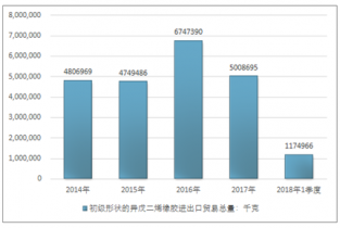 2016年我國初級形狀的異戊二烯橡膠進出口貿(mào)易總量6747390千克,2017年進出口貿(mào)易總量5008695千克;2018年1季度進出口貿(mào)易總量1174966千克。