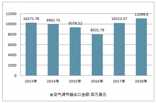 2013年-2016年中國空氣調節(jié)器出口金額下降,2016年中國空氣調節(jié)器出口金額為8031.79百萬美元,同比增長4.1%。2017-2019年中國空氣調節(jié)器出口金額增長,2019年中國空調出口金額為11098.6百萬美元,同比增長8.7%。