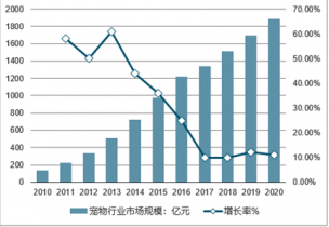 2010-2020年中國寵物行業(yè)市場規(guī)模及增長率走勢