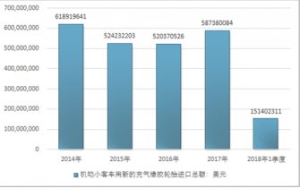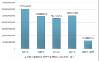 2016年我國機動小客車用新的充氣橡膠輪胎出口總額4627650473美元,2017年出口總額5033732980美元;2018年1季度出口總額1234474546美元。