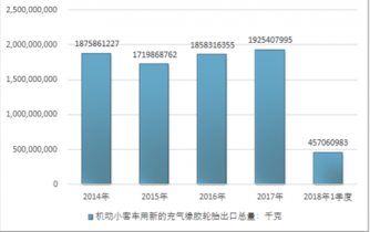 2016年我國機動小客車用新的充氣橡膠輪胎出口總量1858316355千克,2017年出口總量1925407995千克;2018年1季度出口總量457060983千克。